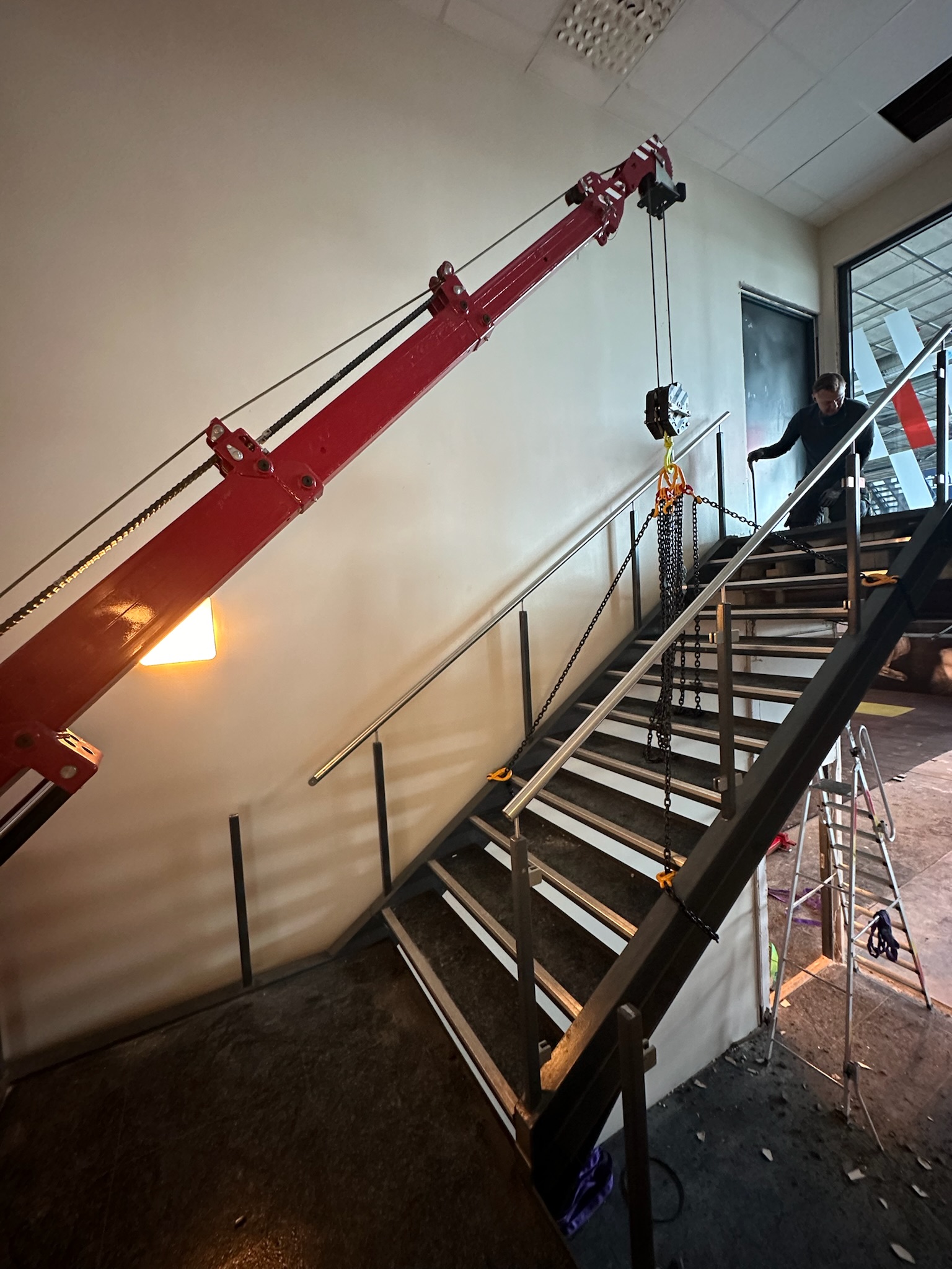 På oppdrag for en kunde med å demontere en innvendig stål trapp på treningssenteret SATS. Oppdragsgiver ønsket å bruke tappen på en annen lokasjon, og med ble vi nødt til å demontere kranen i minst mulige deler.